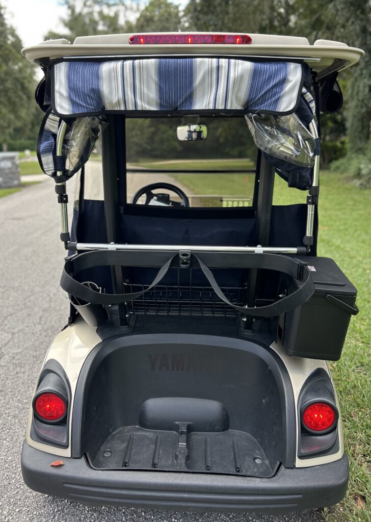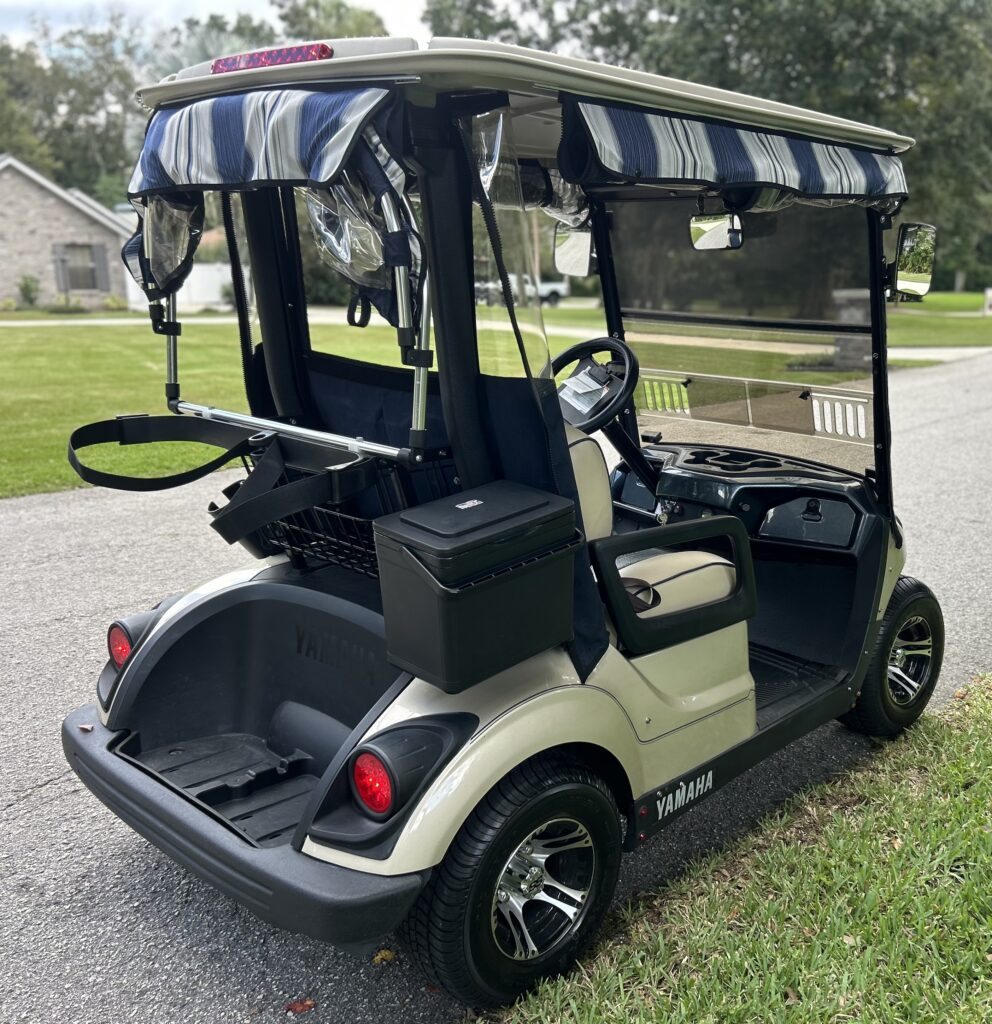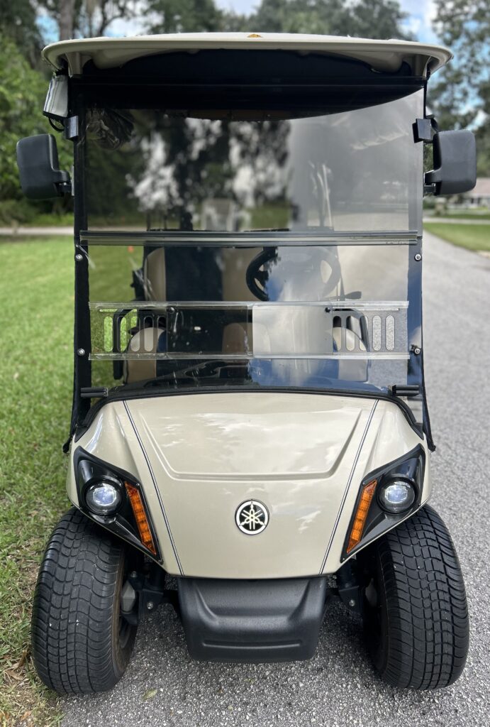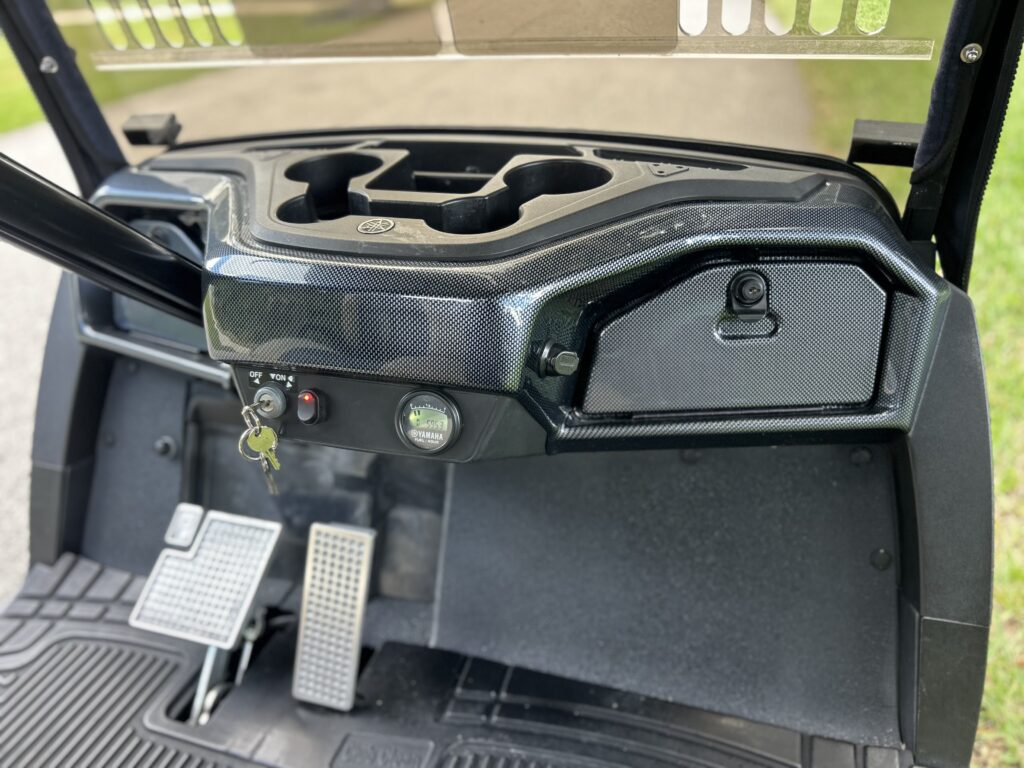 It is loaded up nicely with full LED light kit (LED Headlights, LED tail lights, brake lights, turn signals, horn) with Yamaha illuminated logo all in working order. Also has 3rd brake light in the rear and turn signal indicators in the cart. Comes equipped with custom seats with seatbelts, full matching rain enclosure, carbon fiber dash with lock boxes, in-dash gas gauge/hour meter, USB ports to charge phone, overhead lighting, cooler, vented windshield and floor mat!