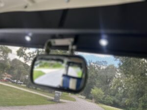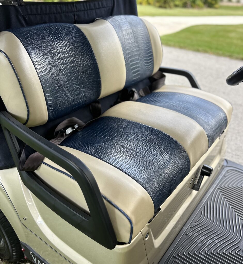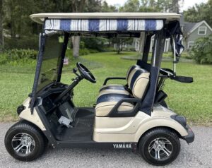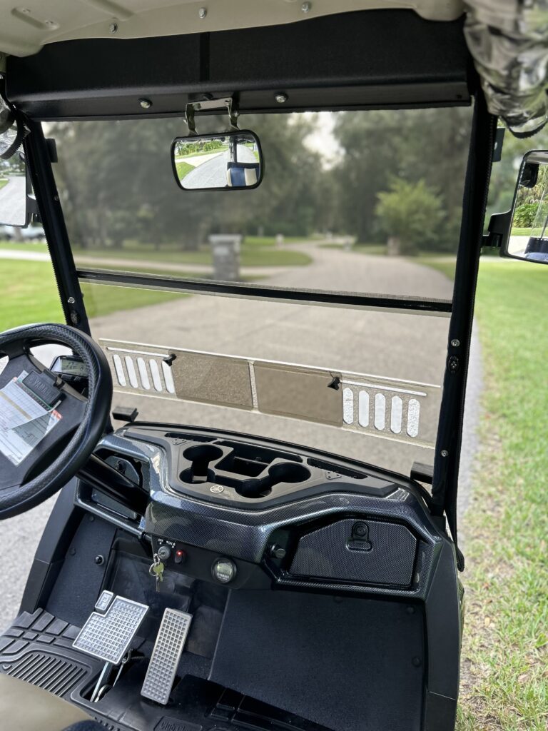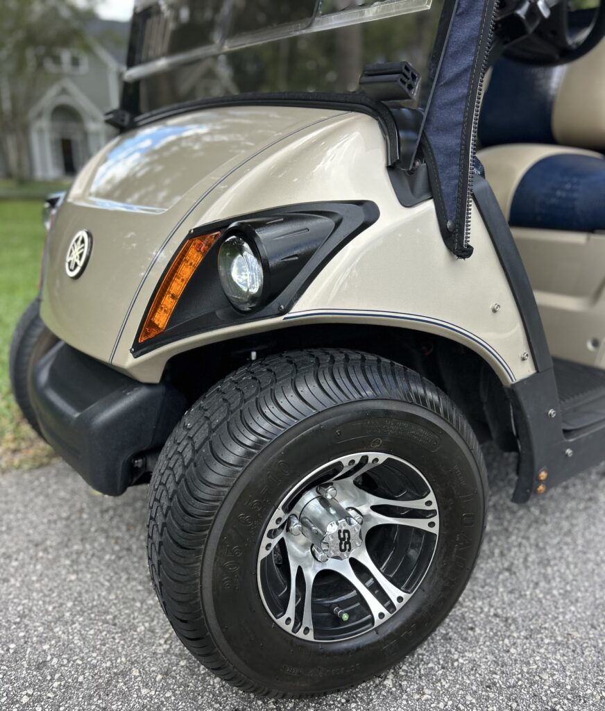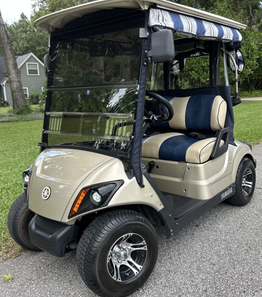 It is loaded up nicely with full LED light kit (LED Headlights, LED tail lights, brake lights, turn signals, horn) with Yamaha illuminated logo all in working order. Also has 3rd brake light in the rear and turn signal indicators in the cart. Comes equipped with custom seats with seatbelts, full matching rain enclosure, carbon fiber dash with lock boxes, in-dash gas gauge/hour meter, USB ports to charge phone, overhead lighting, cooler, vented windshield and floor mat!