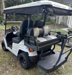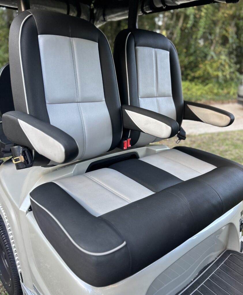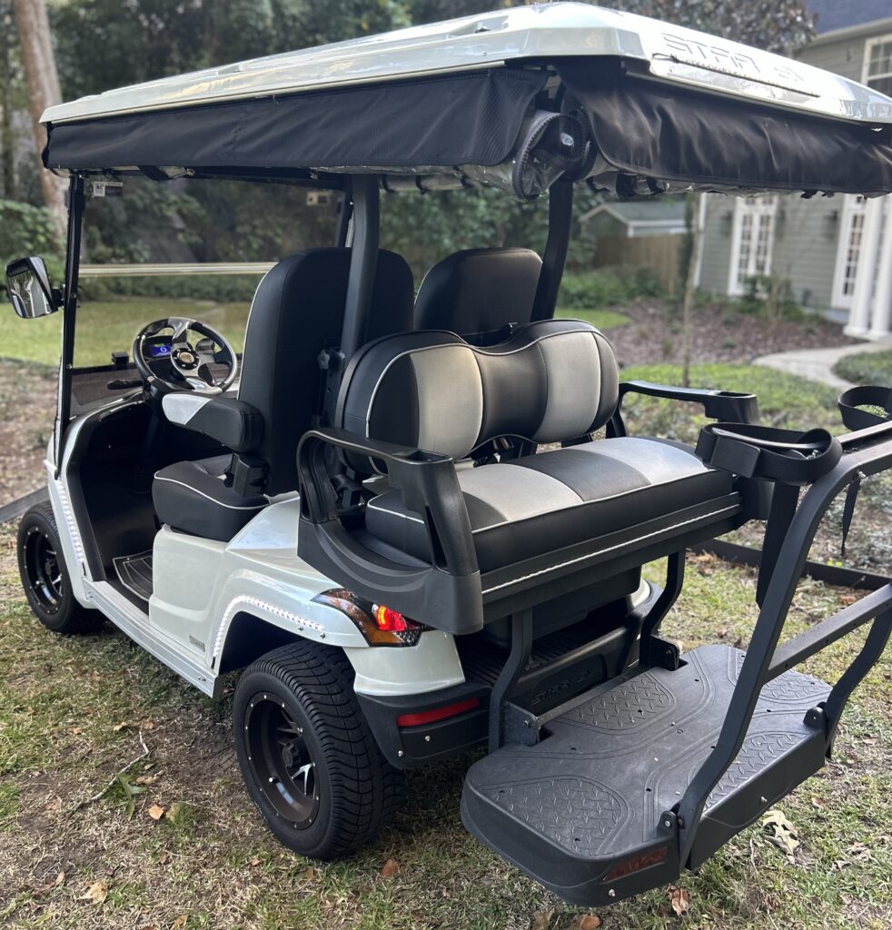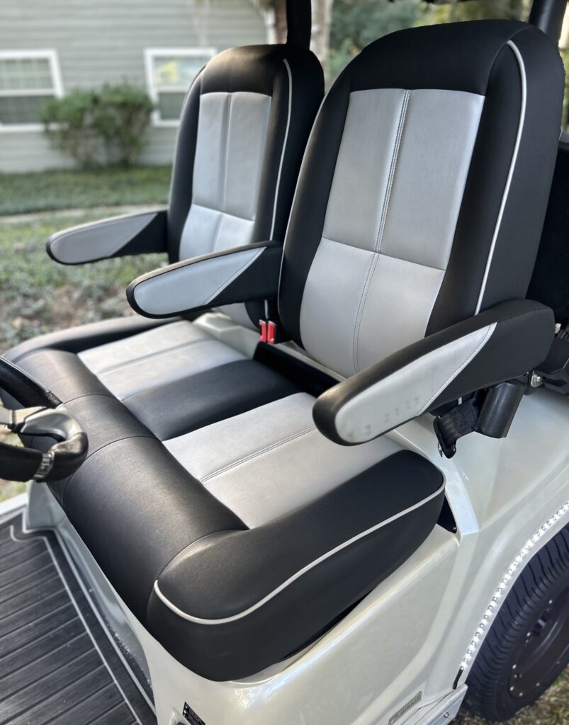 It has many upgrades starting with upgraded Lithium pack for 70-80 mile range. Has UPGRADED Backspin seating with 3 arm rests in the front and matching custom seat in the back with cupholders, storage underneath and seatbelts for all passengers. Equipped with SELF-CANCELLING turn signals and LED strips on the front & back. Has LED screen that functions as speedometer, odometer and battery gauge. Custom dash with lock box, JBL bluetooth speakers, overhead tray, front storage with insulated cooler & USB outlets to charge phone!