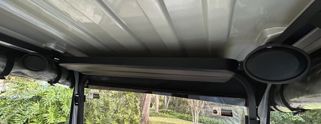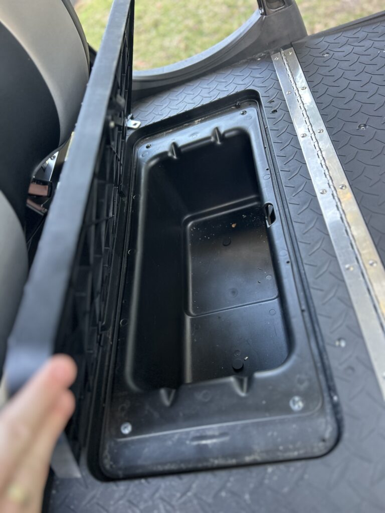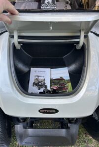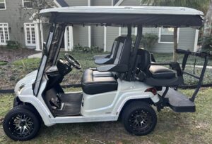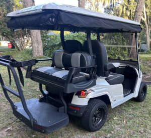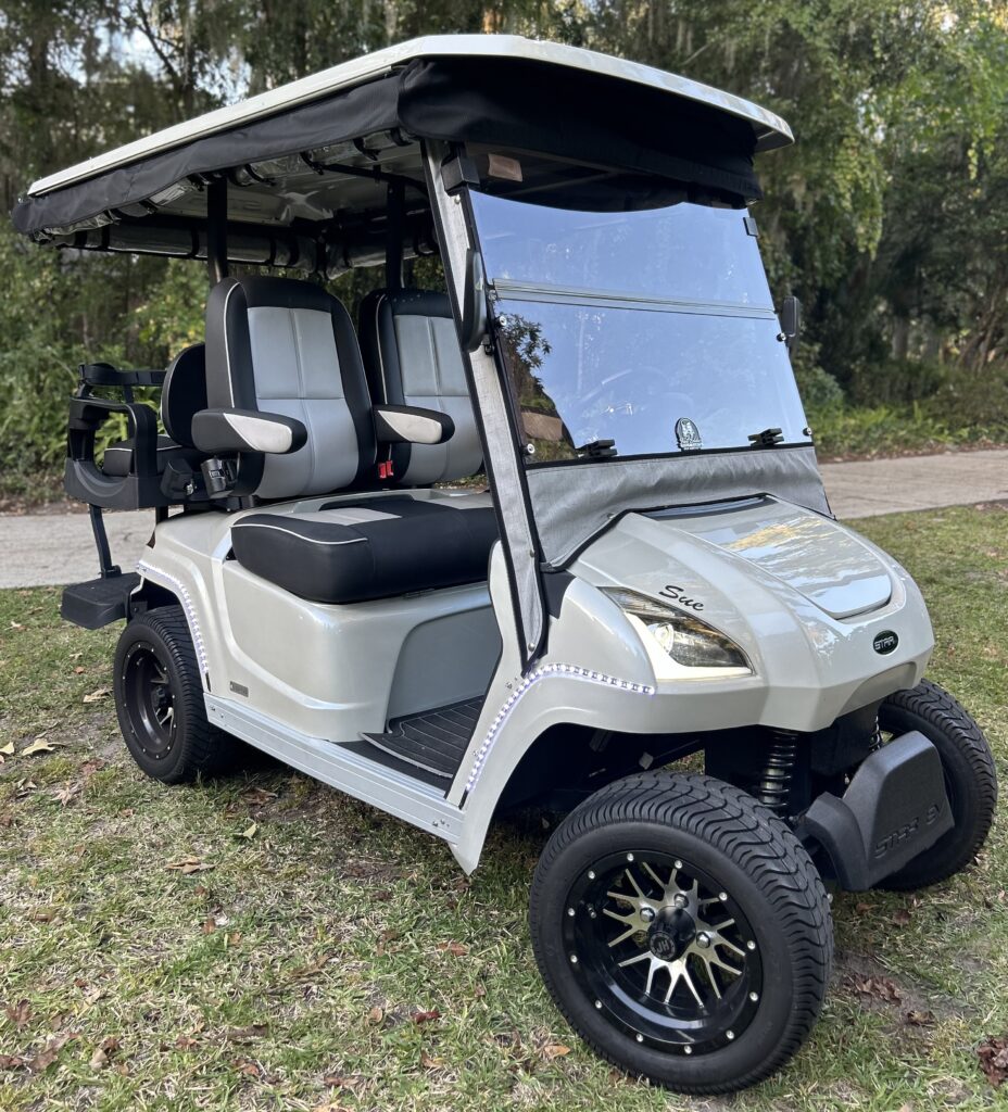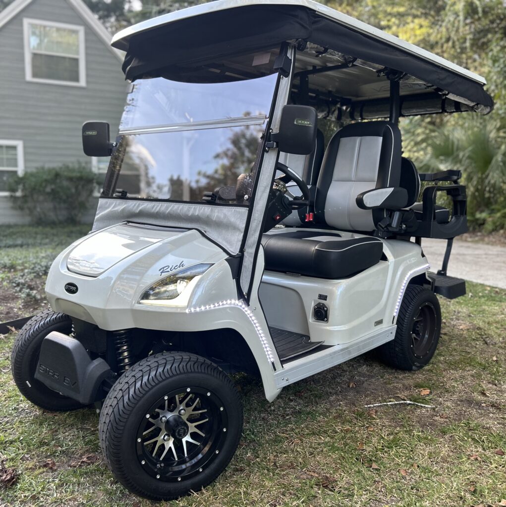 It has many upgrades starting with upgraded Lithium pack for 70-80 mile range. Has UPGRADED Backspin seating with 3 arm rests in the front and matching custom seat in the back with cupholders, storage underneath and seatbelts for all passengers. Equipped with SELF-CANCELLING turn signals and LED strips on the front & back. Has LED screen that functions as speedometer, odometer and battery gauge. Custom dash with lock box, JBL bluetooth speakers, overhead tray, front storage with insulated cooler & USB outlets to charge phone!